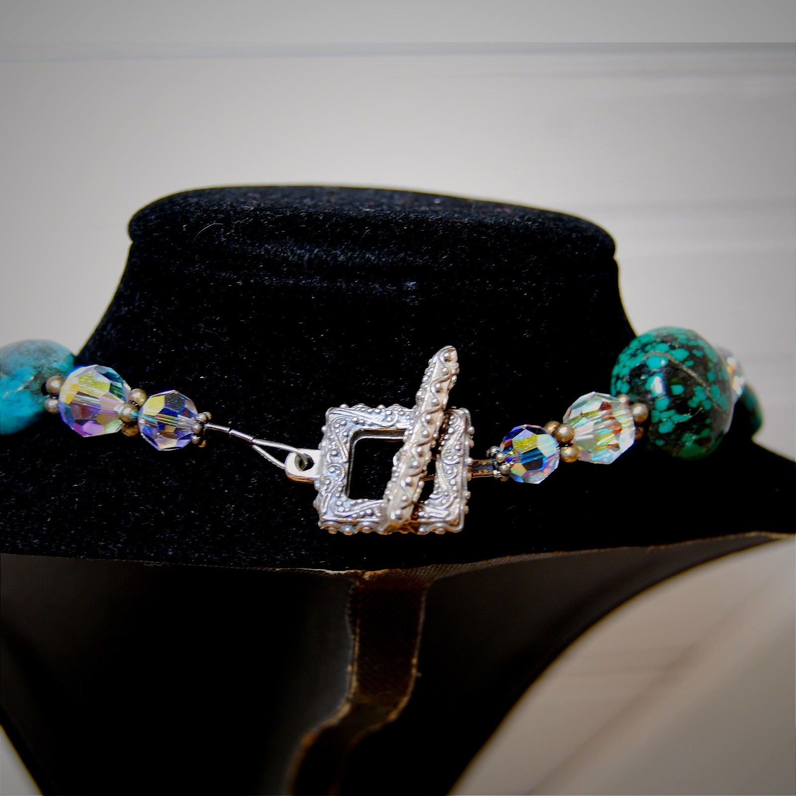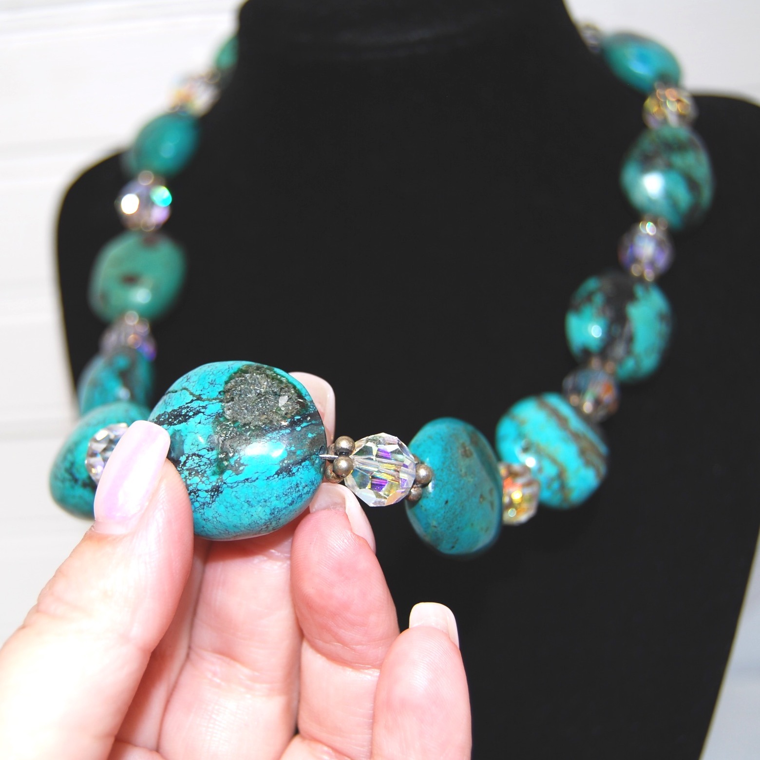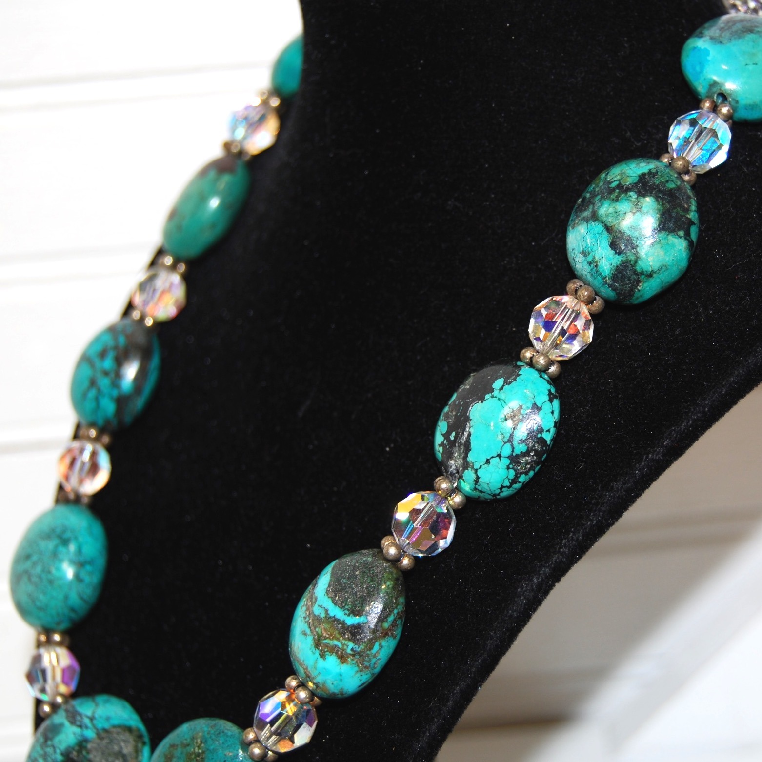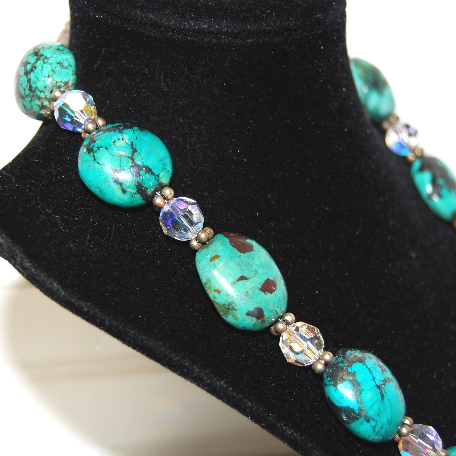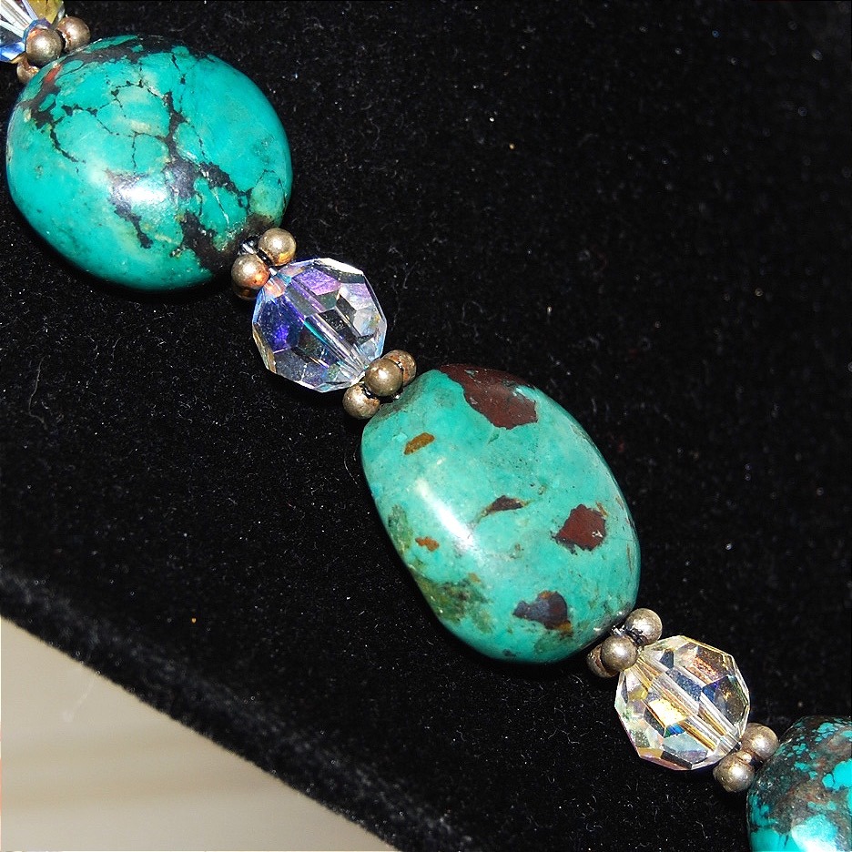 Chunky Turquoise Sterling Silver necklace in great condition. One turquoise bead has a natural dark spot on the rock, see photos for reference. Made with sterling silver clasp and Swarovski beads. Round, polished turquoise gemstones measure about 1x1 inch. The necklace measures about 20 inches end to end and weighs 4 ounces.